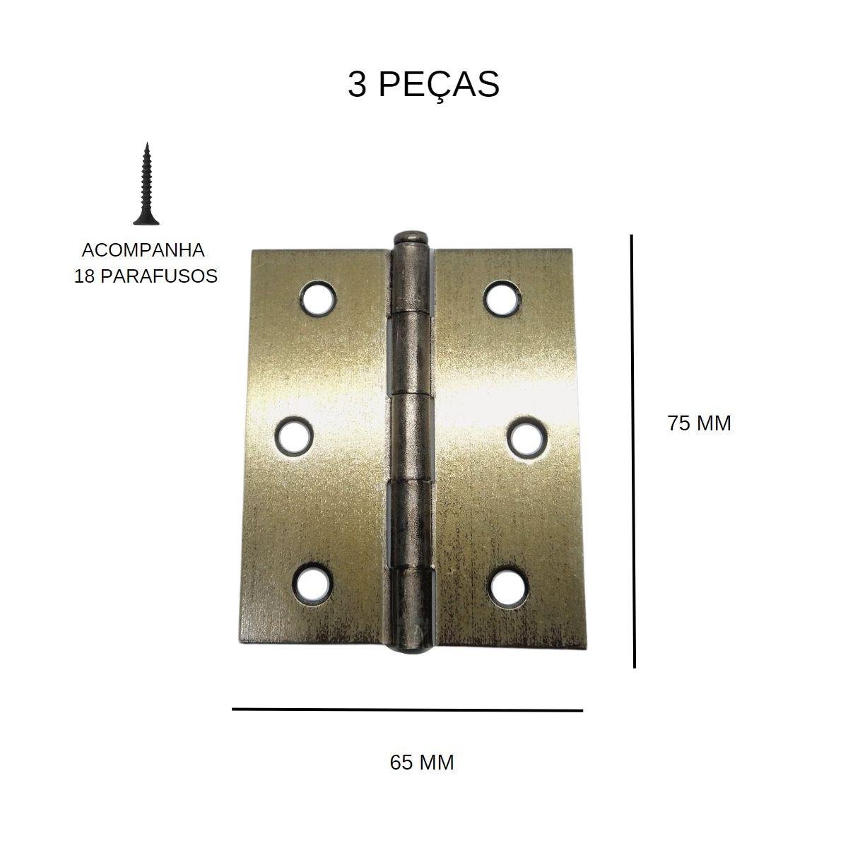 • Conteúdo da Embalagem: 1 Cartela com 3 Peças de Dobradiça para Porta FOE 3×2.1/2″ sem anel (18 parafusos inclusos na cartela)